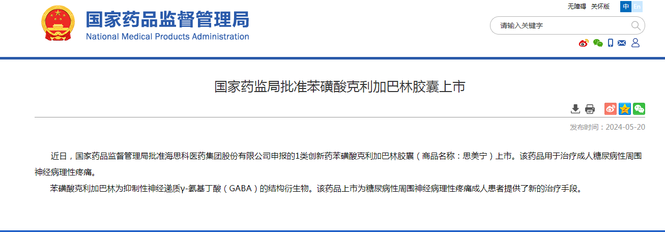 2024年5月20日,中國(guó)國(guó)家藥監(jiān)局(NMPA)宣布批準(zhǔn)苯磺酸克利加巴林膠囊(商品名稱(chēng):思美寧)上市,為成人糖尿病性周?chē)窠?jīng)病理性疼痛患者提供了新的治療選擇。